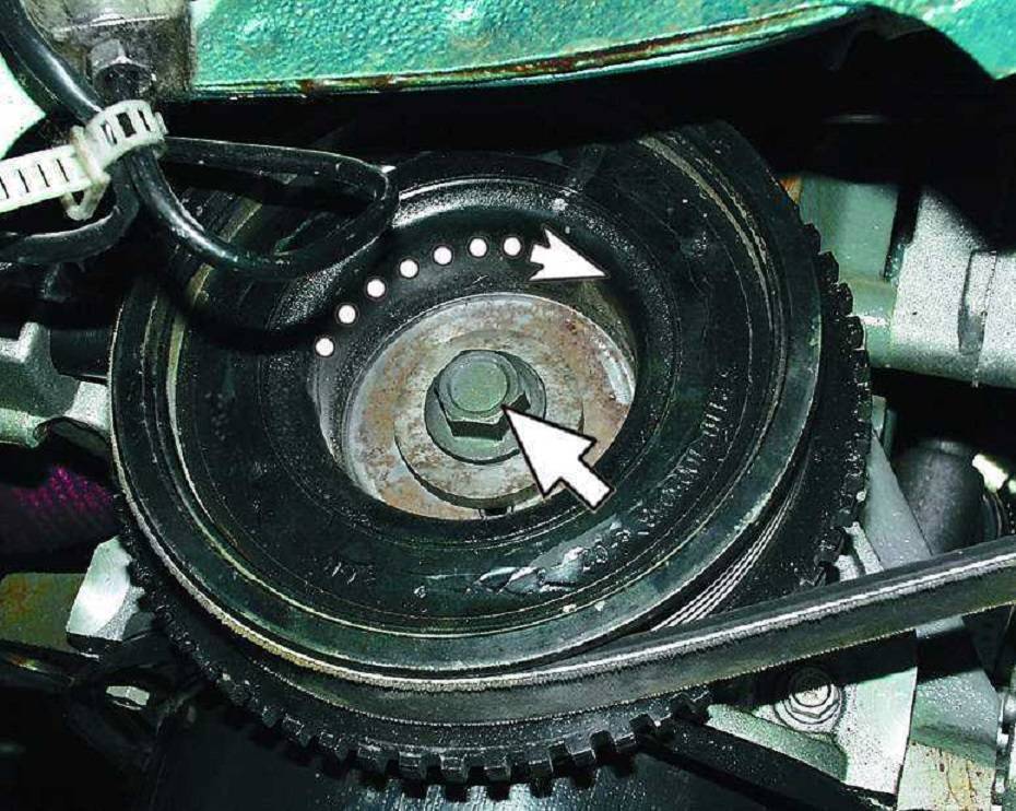 - Чтобы метки на маховике сошлись с таковой на картере КПП (можно наблюдать на лючке), следует прокрутить коленчатый вал. Удобно сделать это, ухватившись за болт крепления шкива.