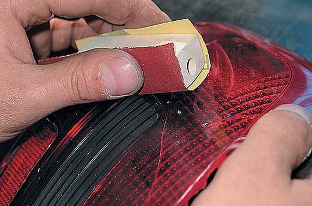 - Склеить поврежденный задний фонарь можно и при помощи таблеток из пластмассы. Вам достаточно нагреть одну таблетку, после чего намазать на поврежденное стекло. После застывания поверхность обрабатывается мелкозернистым абразивом (наждачкой, абразивной глиной) для ликвидации излишков материала.