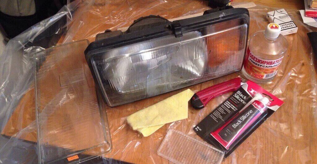 Перед склеиванием пластиковых фар необходимо удалить загрязнения, обработать стыки наждачкой, обезжирить и просушить. Затем осколки стекол фар нужно разложить и соединить между собой, предварительно нанеся на стыки эпоксидный клей. После используются марлю или стеклоткань: на материал наносится второй слой эпоксидки, лишний клей удаляется. Поверхности фар хорошо просушивается.