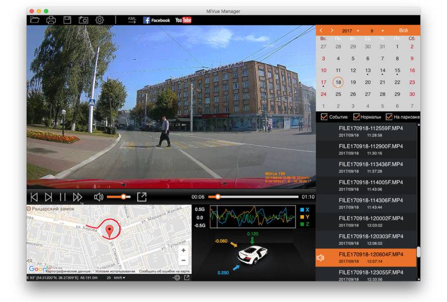 Во-первых, посредством GPS девайс определяет где находится автомобиль и записывает всю эту информацию в файл (он для каждого видеоролика свой и находится в той же папке на флешке). На видео указывается штамп с актуальными координатами, а, если открывать видеоролики через специальное приложение на компьютере, то можно посмотреть, на каком участке дорог была сделана запись. И всё это через привычные карты от Google.