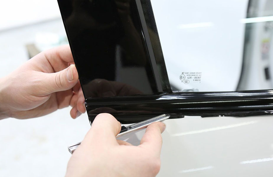 Стекольный герметик — средство довольно эффективное, но требующее фиксации склеиваемых деталей в течение длительного времени. На период застывания полосы приходится надёжно крепить к дверцам малярным скотчем, не повреждающим лаковой поверхности.