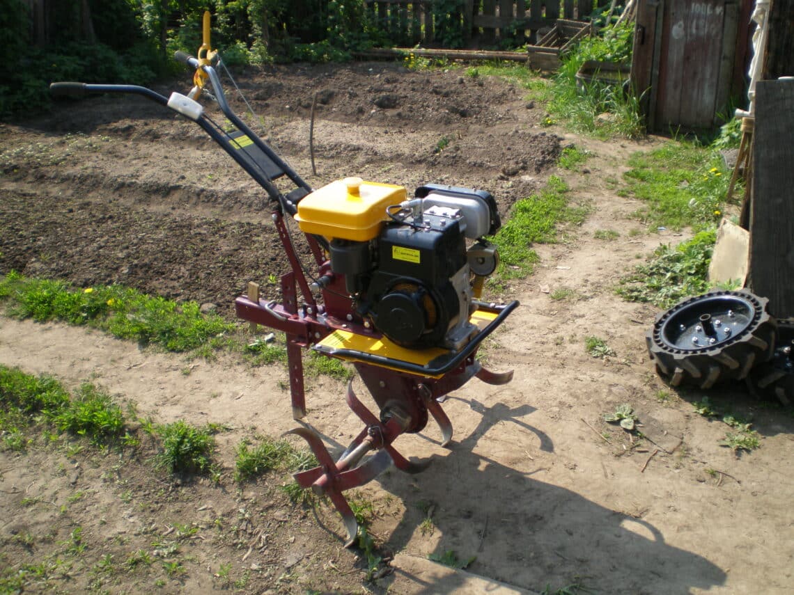 - Ходовая часть. Это рама и вмонтированные в неё ведущие колёса и узлы. Межколёсное расстояние определяется оператором. На многих моделях усиленные колёса пневматического типа с агрессивными протекторами. Также изготовителями предусмотрены удобные условия хранения техники на специальных металлических упорах. Их можно использовать, если необходимо остановить мотоблок во время выполнения работ;