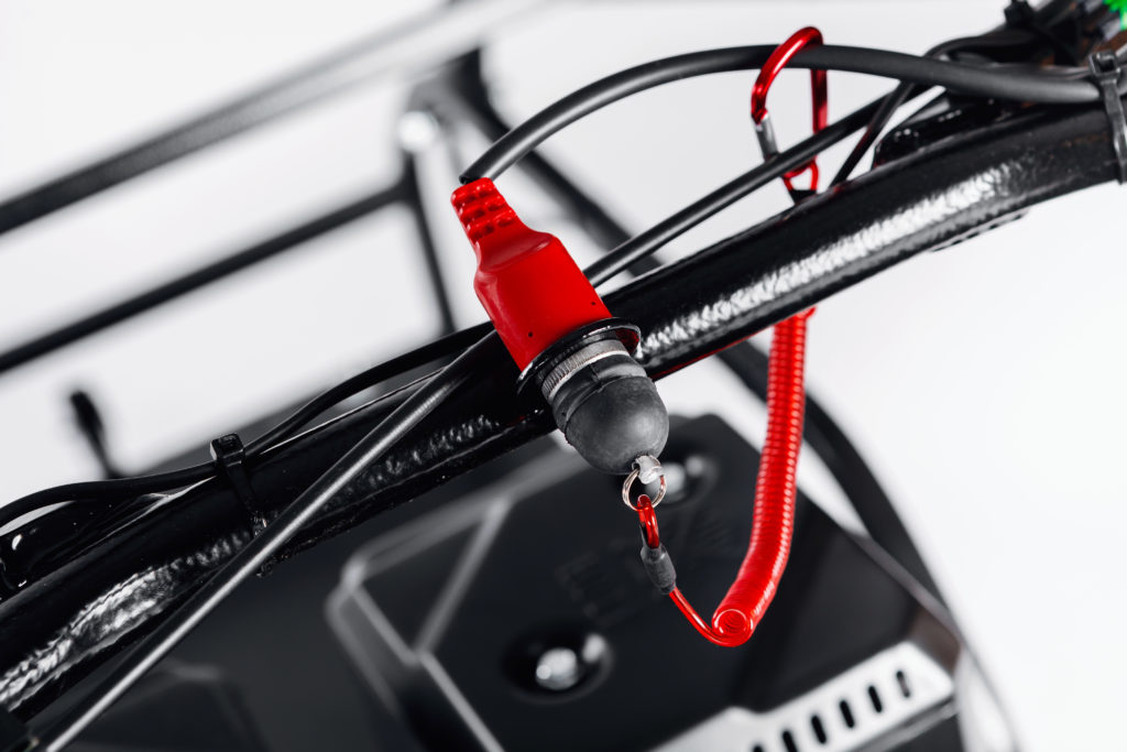 Все необходимые рычаги сосредоточены на руле. Здесь есть кнопка запуска, глушилка, чека аварийной остановки, включение/выключение фары, курок газа.