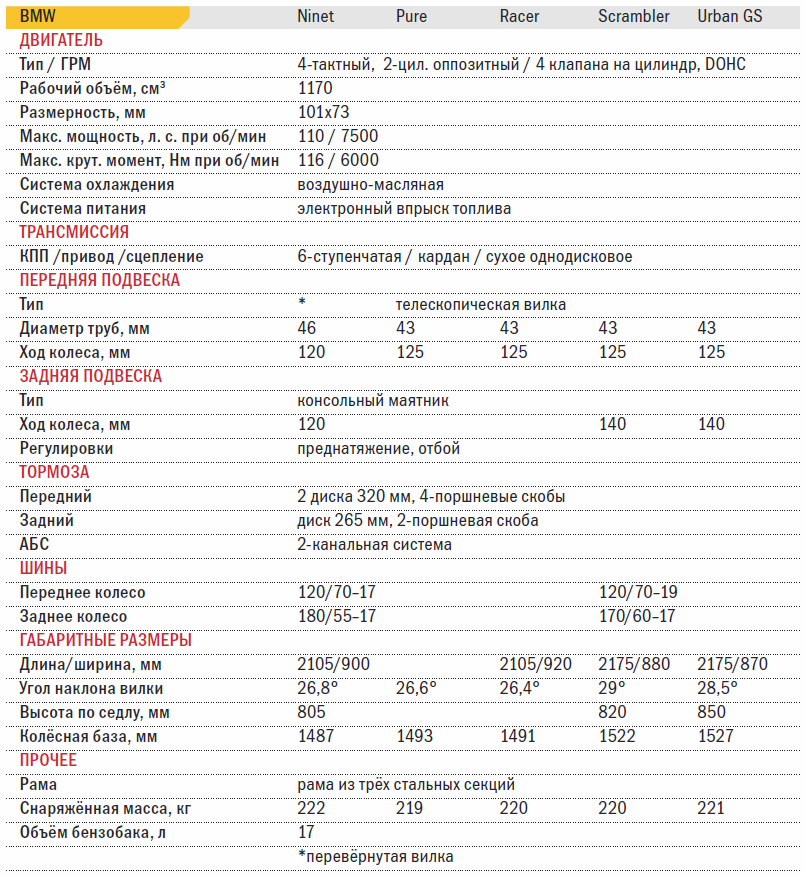 | Вес: | 222 кг (обычная версия R NineT); 220 кг (Scrambler/Racer); 219 кг (Pure) кг |