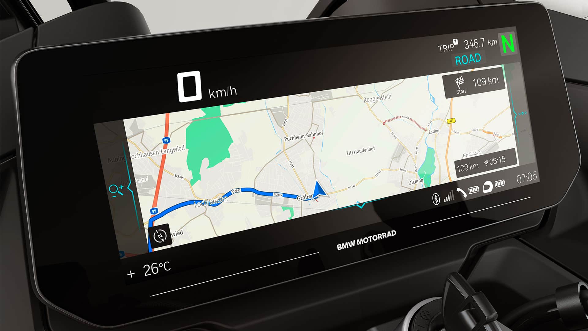 It has a split screen function so you can view your main display with revs, speed and gear position on the left and choose any number of menu functions, including its in-built sat nav on the right. Four buttons, fitted to the left side of the fairing, short cut you to your favourite menu functions.