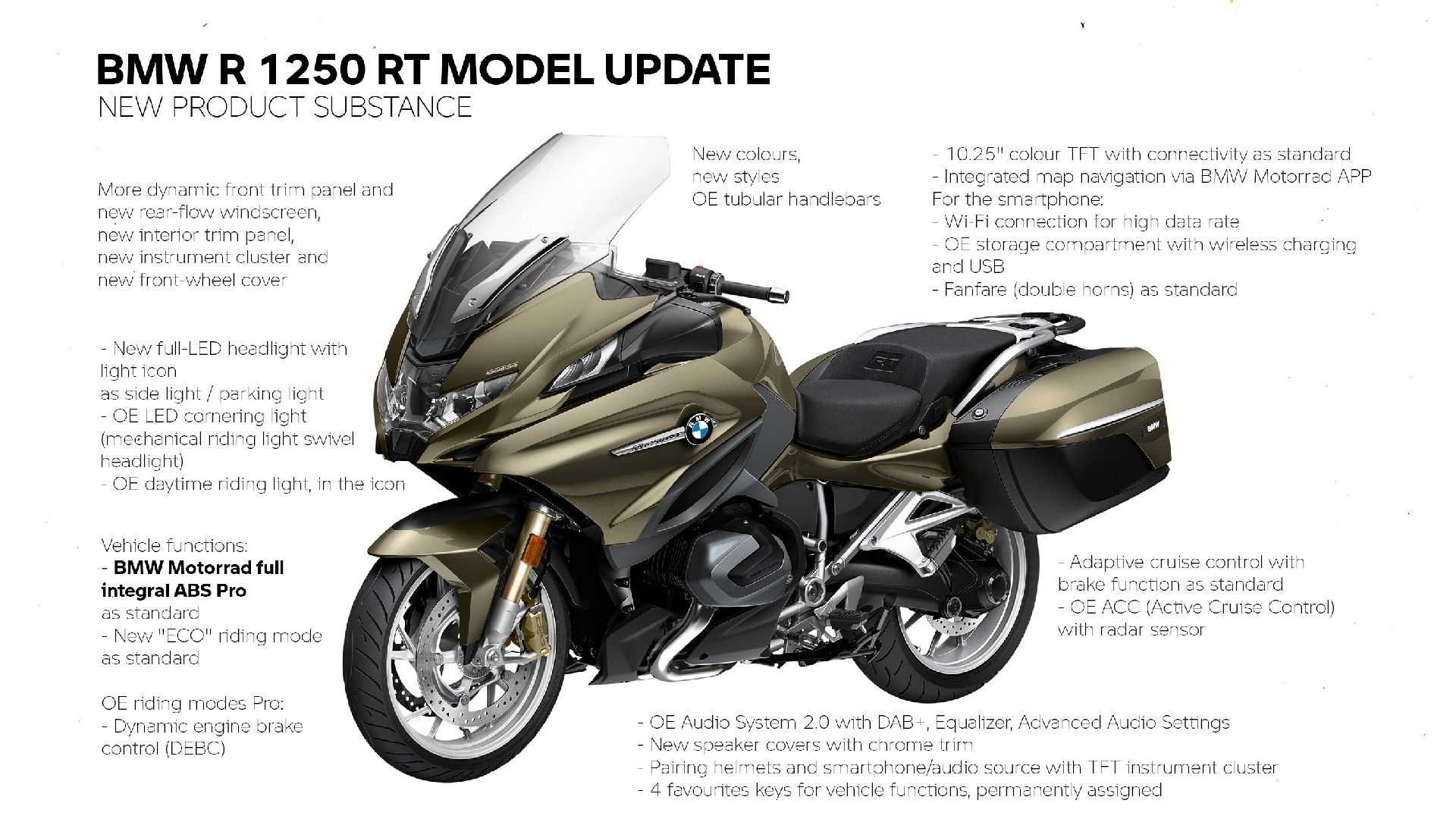 Увы, баварцам не удалось сохранить интригу вокруг мотоцикла — интернет-ресурс Bennetts обнародовал основную техническую информацию. Можно утверждать со стопроцентной уверенностью, что кочевник получит имя R1250GS, отражающее объем более тихого и эластичного двигателя. Литраж увеличится с 1170 до 1254 «кубиков», а отдача вырастет со 125 до 136 л.с. при 7750 об/мин (+500 об/мин). Характер агрегата, очевидно, сгладится, в том числе, благодаря вероятной установке фазовращателей. Параметры мотора для турера R1250RT, скорее всего, будут идентичными, по аналогии с нынешним поколением мотоциклов, либо немного отличаться в большую сторону.