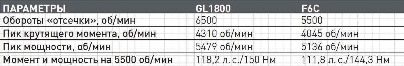 > Двигатель мотоцикла Honda F6C полностью идентичен устанавливаемому на GL1800 Gold Wing — с некоторыми отличиями в «навесном» оборудовании и системе управления. Турер Honda показывает на динамометрическом стенде 118,5 л. с. и 166,5 Нм при заявленных 118/167, что вполне укладывается в погрешность сборки мотора и методики снятия мощностных характеристик. В случае с «Валькирией» производитель обещает 117 л. с. и 167 Нм. Сравним некоторые параметры, измеренные нами на GL1800 и F6C: