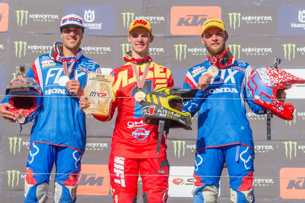 В 2015 году гонщики команды HRC, так и не смогли добыть титул в классе MXGP, но занять два призовых места им было по силам: француз Готье Полин (слева) стал серебряным призером чемпионата мира, а российский пилот HRC Евгений Бобрышев (справа) добыл «бронзу».