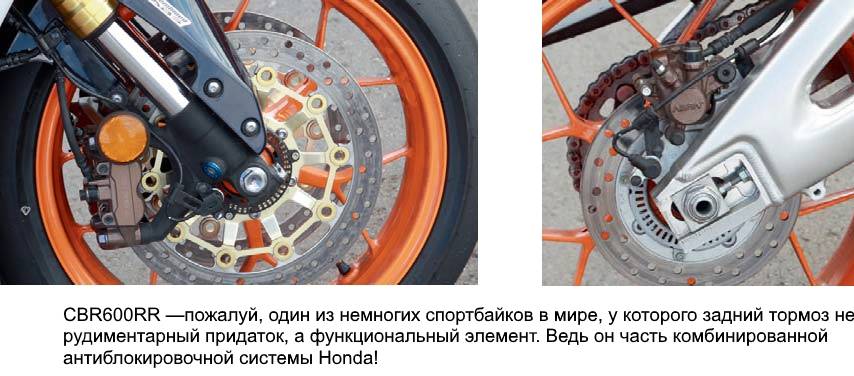 Несмотря на то что тестовый F3 был единственным мотоциклом из всех участвовавших в сравнении аппаратов, который не получил гоночные слики, а «выступал» в свободной категории на стандартных покрышках, сложностей с контролем сцепления шин с полотном трека и «отловом» момента срыва в поворотах не было. Можно подумать, что это заслуга трекшнконтроля, которым, напомню, итальянский спортбайк оборудован в стандартной комплектации, в то время как для японских визави эта система недоступна в принципе. Однако позволю себе усомниться в эффективности «стокового» трекшн-контроля, который на тестовом F3 был выставлен в самый «щадящий» режим, в котором система почти не вмешивалась в процесс управления мотоциклом. Мотоцикл Honda, получивший в 2013 году обновленную вилку Showa BPF и полностью регулируемый моноамортизатор той же марки,— определенно, самый стабильный и подконтрольный из всей тройки сравниваемых машин, что более чем гармонировало с дружелюбным характером мотора CBR600RR!