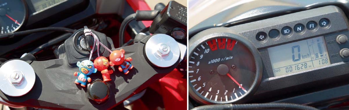 Верхняя траверса без единого отверстия выглядит монументально и, должно быть, весит неприлично много. Впрочем, фигурки супергероев в качестве брелока на ключе зажигания нивелируют любые недостатки мотоцикла. Приборная панель проста и лаконична: стрелочный тахометр, цифровой спидометр и два «столбика», информирующих о запасе топлива и температуре охлаждающей жидкости двигателя.