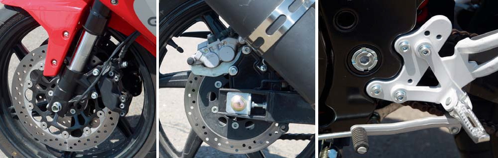 С большой долей вероятности, даже установка тормозных колодок от известного производителя не сможет решить проблему неэффективной работы тормозов —дело тут в самих механизмах… Тем не менее, армированные шланги и новые колодки должны хоть немного, но улучшить тормозную систему. Уже в базовой комплектации мотоцикл укомплектован регулируемыми подножками —совсем как на настоящих спортбайках! Не самый полезный для «дорожника» аксессуар, но всё же приятно.