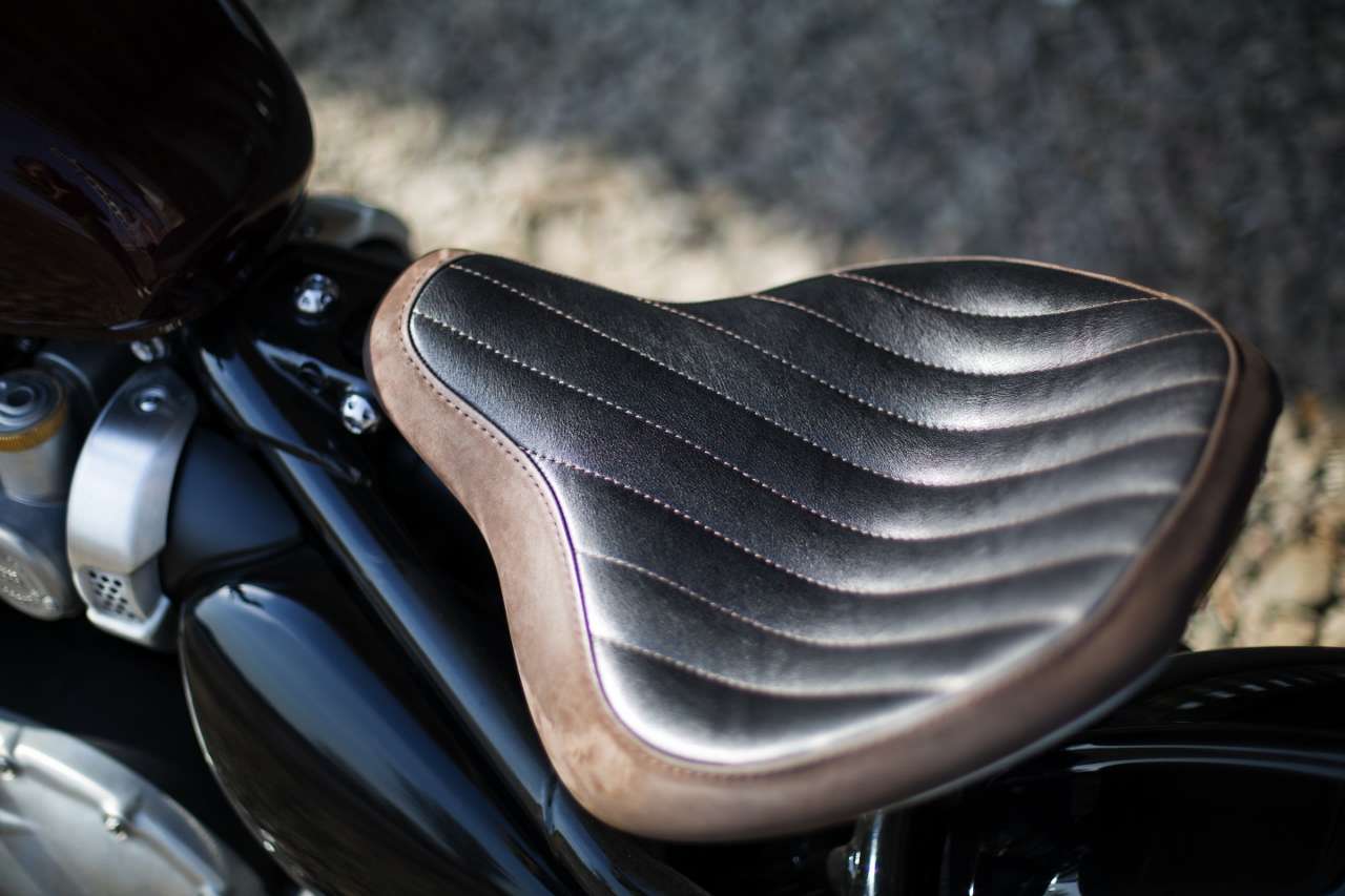 Чтобы добиться визуального сходства с фирменной чертой бобберов – жесткой рамой типа «хардтейл» – инженерам Triumph пришлось пойти на хитрость и спрятать моноамортизатор под сидением, разместив его внутри рамы практически горизонтально. Если не разглядывать конструкцию досконально, то на выходе получился настоящий «сухарь».