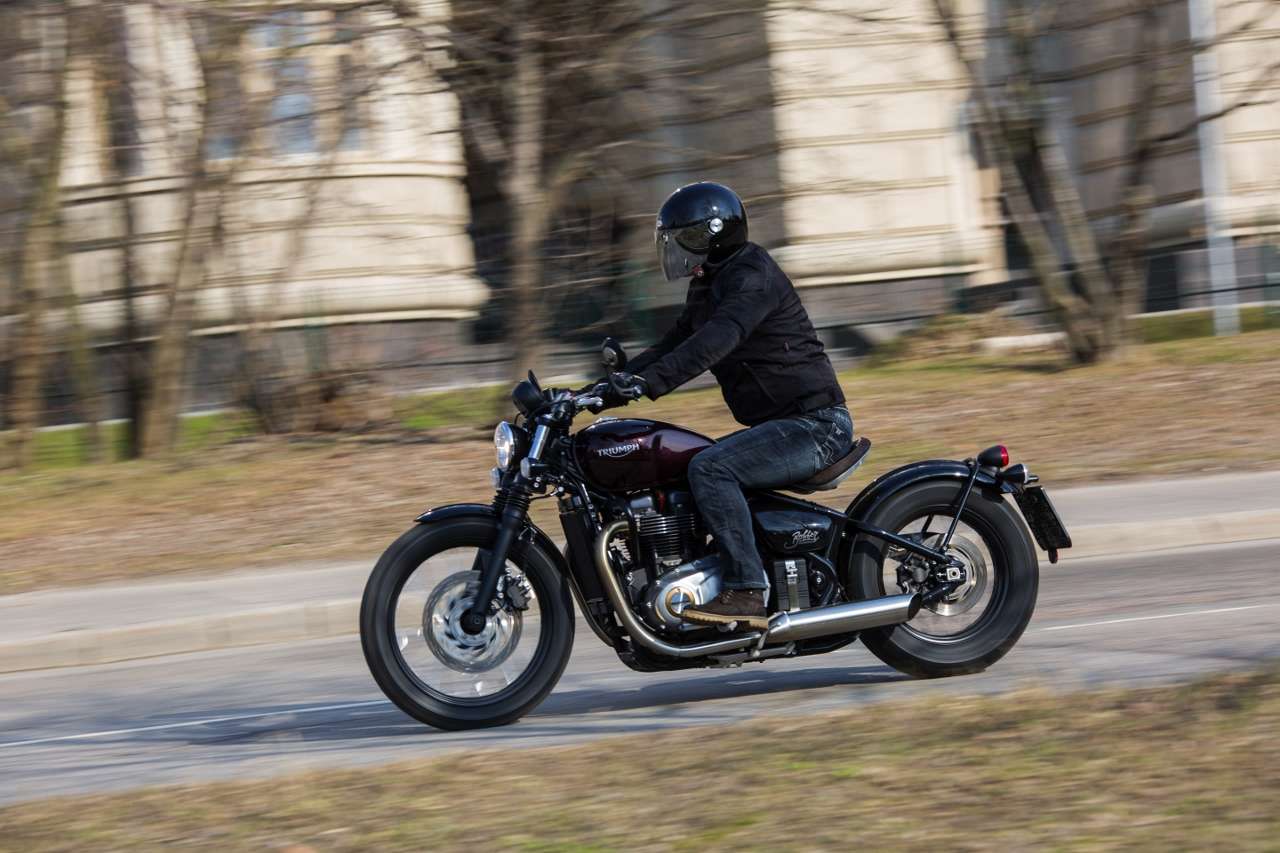 Справедливости ради стоит отметить, что теперь пика мощности британская «двойка» достигает на отметке 6100 об/мин – на 450 оборотов в минуту раньше мотора-предшественника. Впрочем, про показатель максимальной мощности забываешь на первом же свободном участке, где дорожная обстановка позволяет как следует ускориться. Впечатляющие 106 Нм крутящего момента, доступные уже на отметке 4000 об/мин, весьма азартно разгоняют 228-киллограмовый мотоцикл. После десятка лихих разгонов совершенно точно начинаешь понимать, что шильдик «1200 HT» (HT – high torque в пер. с ан. яз. «высокий крутящий момент») не зря украшает двигатель Triumph Bonneville Bobber.