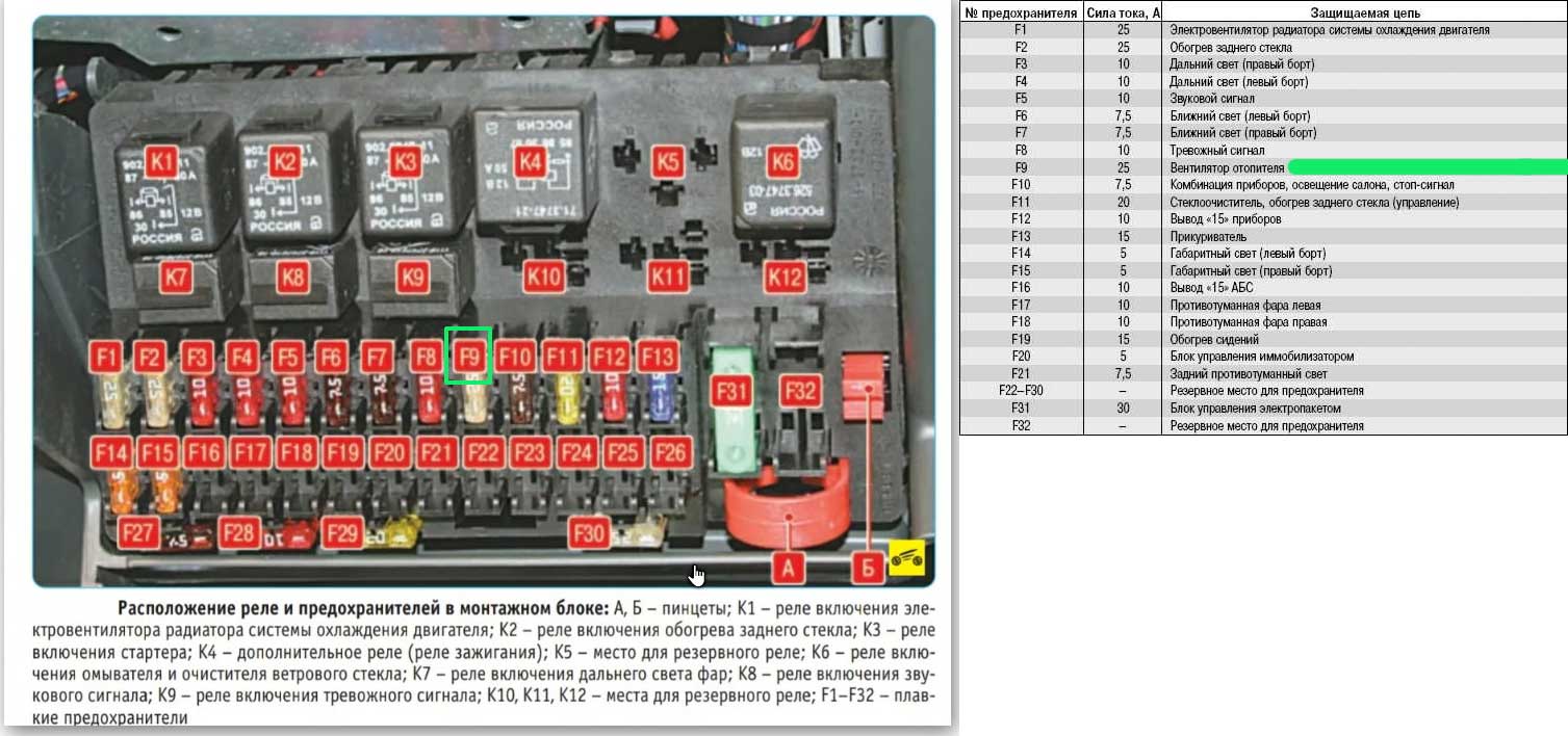 - Перегорел предохранитель. Предохранитель F7 с силой тока 30А закреплён не только за отопителем, но и за подсветкой бардачка, электродвигателем омывателя фар. Причиной перегорания предохранителя может стать короткое замыкание. Поэтому, если проблема кроется именно в этом, то необходимо перебирать всю цепь и искать источник замыкания;