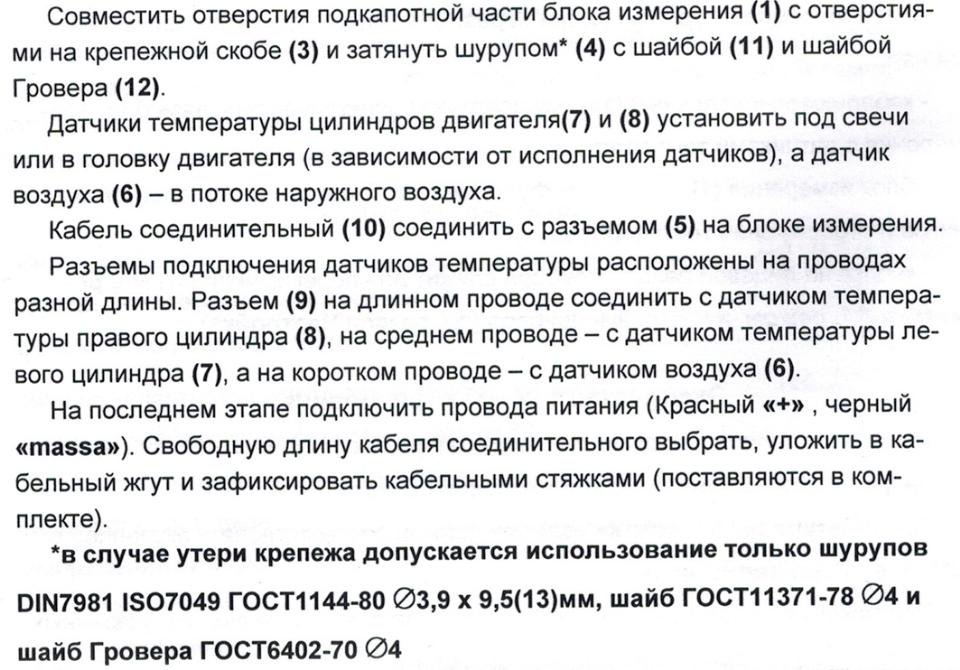 Датчики прибора выполнены в виде шайб и устанавливаются на свечу зажигания вместе со штатной уплотнительной шайбой свечи зажигания. В зависимости от диаметра резьбы свечи зажигания прибор комплектуется шайбами диаметров 14 мм., 12 мм. и 10 мм. Для удобства монтажа и эксплуатации датчики соединяются с прибором посредством разъемного соединения. При необходимости удлинения соединительного провода используется удлинитель необходимой длины. При достижении в районе свечи зажигания любого из датчиков установленной пользователем критической температуры прибор будет сигнализировать мерцанием экрана. Например: если прибор установлен в режим отображения температуры 1-го датчика, а температура 2-го датчика достигла критического значения, то экран прибора начнет мерцать и прибор автоматически перейдет в режим отображения температуры того датчика, на котором зафиксирована критическая температура (2-го датчика). При этом в правом углу экрана будет светится яркая точка, соответствующая этому датчику, а экран прибора будет продолжать мерцать до снижения температуры ниже критической.