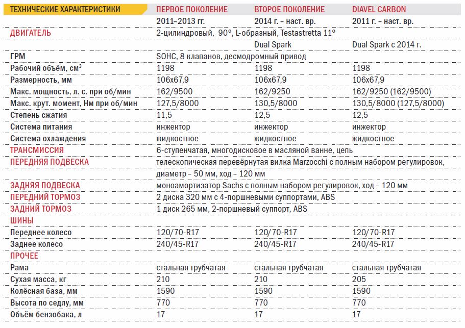 А вот сухая, да и снаряженная массы отличаются прилично. Дьявола посадили на серьезную диету, и он умудрился скинуть аж 13 кг. Да и это неудивительно, во-первых сам двигатель V4 легче на 5кг., да и новое шасси без стальной рамы Trellis легко сбросило еще 8 кг., что дало показатель сухой массы в 211 кг (исходя из оф. сайта Ducati).