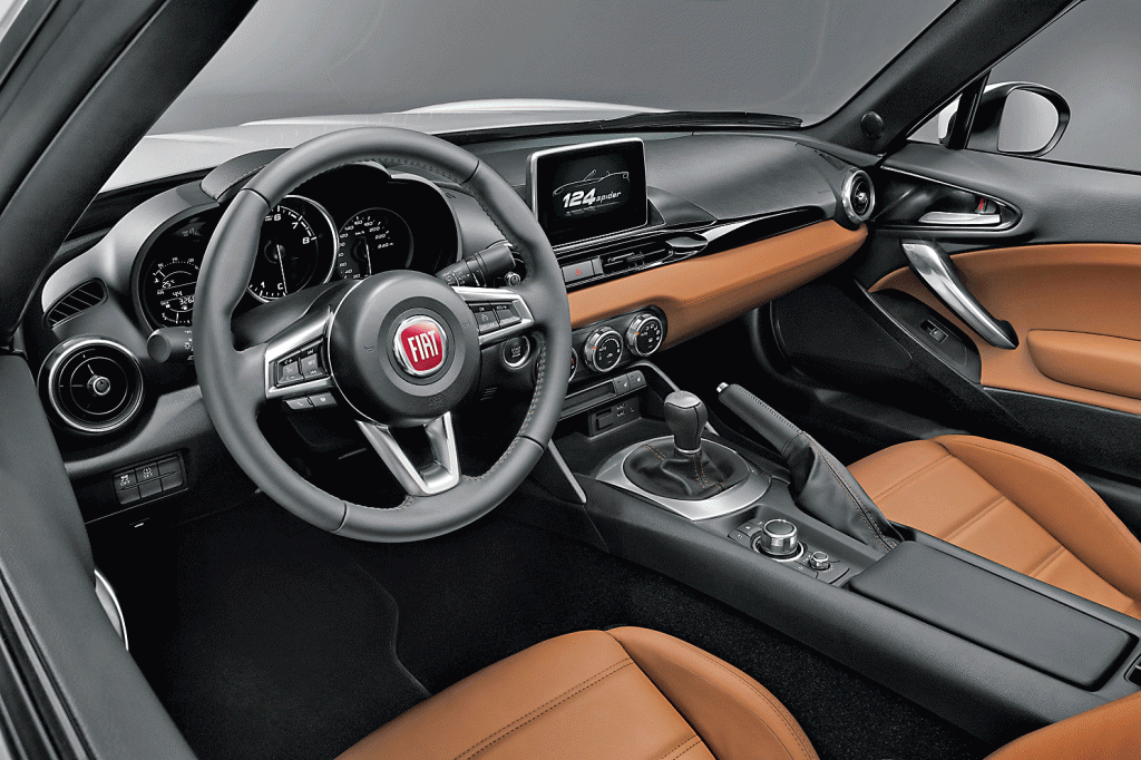 Кузов итальянского родстера окрашивается в один из восьми вариантов цвета эмали: Bianco Gelato (белый), Bianco Ghiaccio (бежевый), Azzurro Italia (лазурный), Grigio Argento (серый), Grigio Moda (темно-серый), Rosso Passione (красный), Bronzo Magnetico (темно-коричневый) или Nero Vesuvio (черный). Интерьер итальянского родстера с мягким куполом крыши способных складываться за 25 сек в целом копирует оформление салона соплатформенной японской модели Мазда МХ 5, но несколько оригинальных фиатовских деталей присутствуют: рулевое колесо с эмблемой Fiat, иное оформление козырка над приборной панелью, оригинальные карты дверей, мультимедийная система с цветным сенсорным экраном диагональю 7-мь дюймов не смотря на японское происхождение именуется Fiat Connect 7.0. Так же в базовой комплектации присутствует премиальная аудиосистема Bose с 9-тью динамиками, подогрев сидения и рулевого колеса, климат-контроль, система бесключевого доступа, фары головного света с адаптивным управлением, круиз-контроль и современные системы безопасности. Багажник способен принять 140 литров грузового объема.