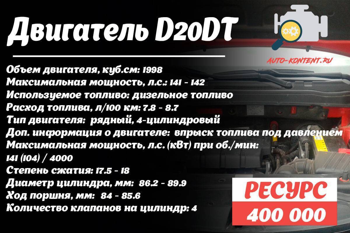 - D20DT – двухлитровый дизельный мотор с системой турбонаддува с заявленной мощностью 145 лошадиных сил;