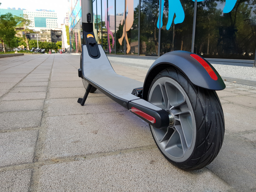 Насчет заметности самоката в ночное время тоже переживать не стоит: по бокам в задней части расположены два стоп-сигнала, а спереди — мощный, но не ослепляющий отражатель с зоной видимости в 13,5 метров. А еще в комплекте идет механический звонок, достаточно громкий, чтобы возвестить о своем появлении зевающих прохожих.