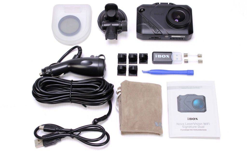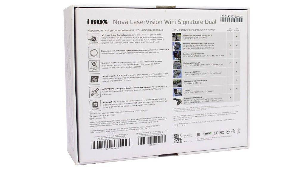 Поставляется iBOX Nova LaserVision WiFi Signature Dual в плотной картонной коробке с нанесенным изображением самого устройства, а также таблицей с его подробными техническими характеристиками.
