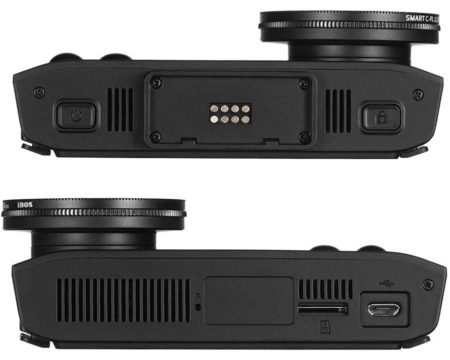 В верхней части устройства находится кнопка «пуск» и гнездо для фиксации к поворотному механизму. Нижняя часть содержит слот с картой памяти micro SD, а также микрофон и вентиляционные отверстия. Содержательный дисплей отображает все информативные подробности.