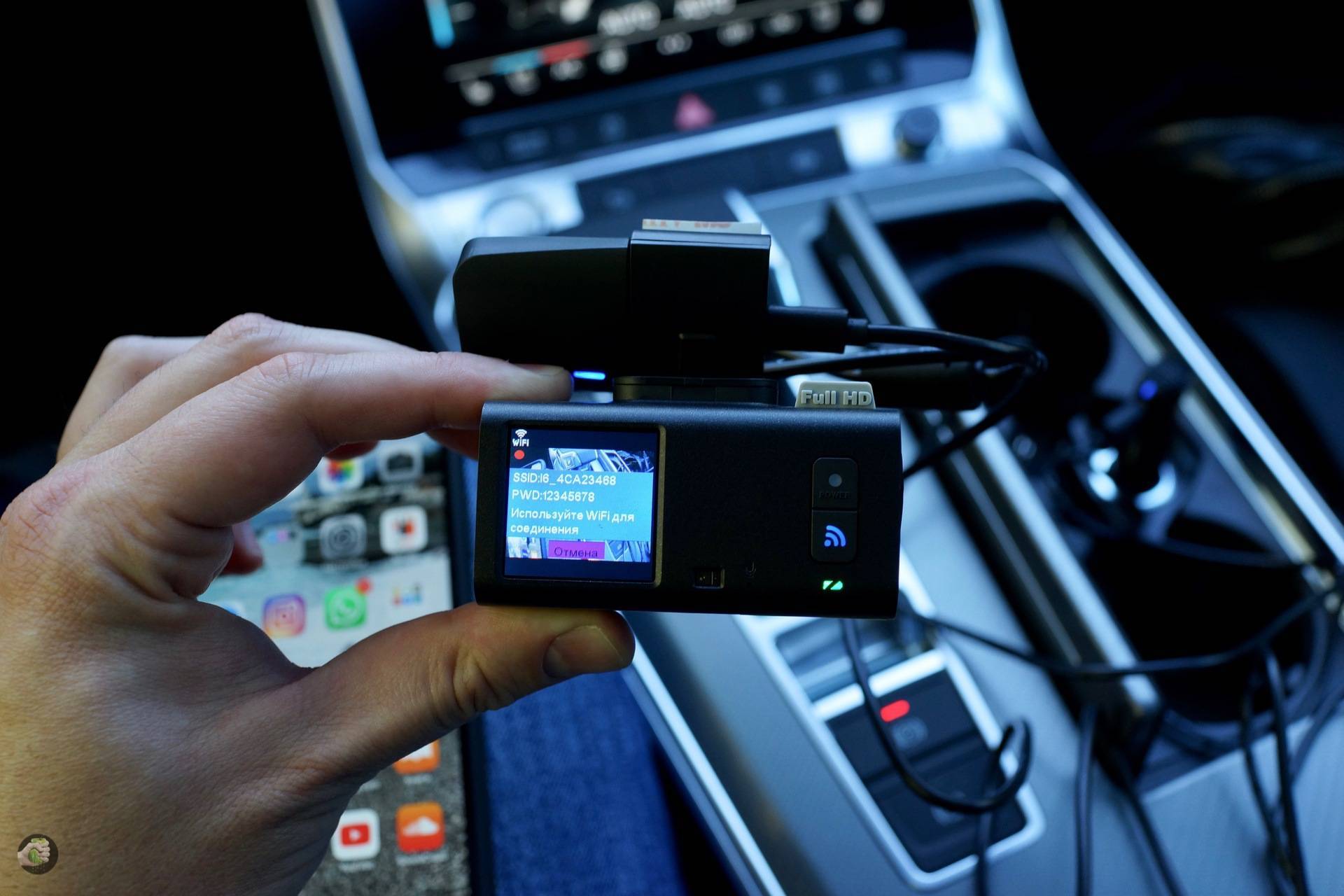 У вас есть две кнопки: включения и Wi-Fi, вот с их помощью и придётся орудовать. Чтобы включить Wi-Fi, нужно нажать и подержать кнопку Wi-Fi (простите за официоз), на экране появится название точки доступа и пароль, потом идёте в настройки смартфона, подключаетесь, заглядываете в приложение RoadCam и делаете всё как положено.