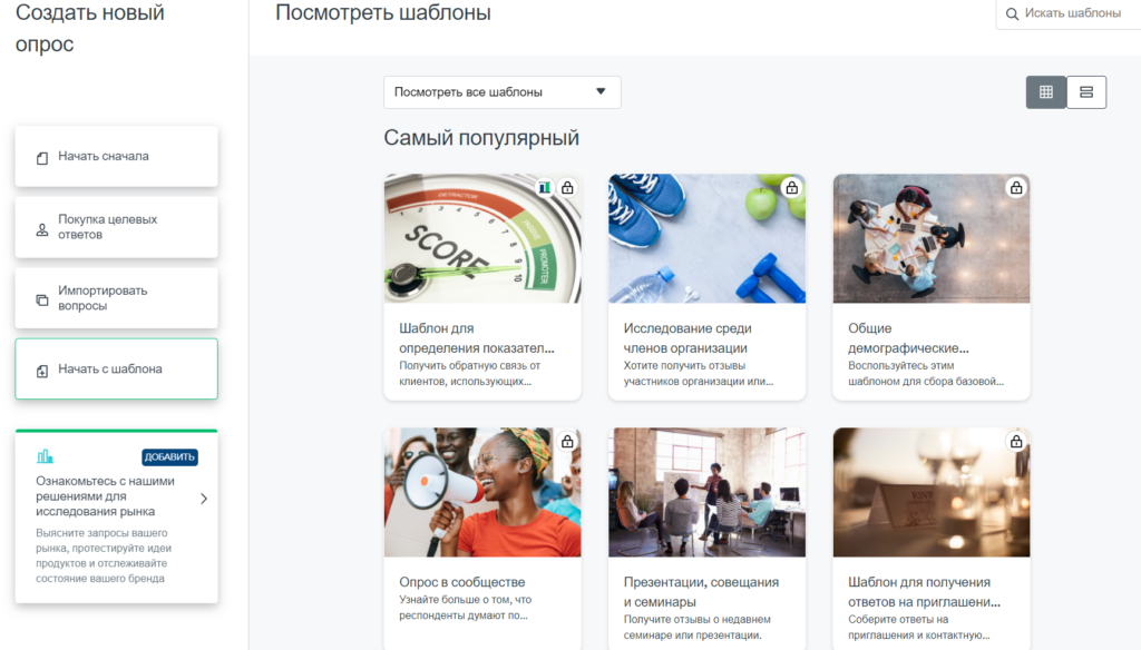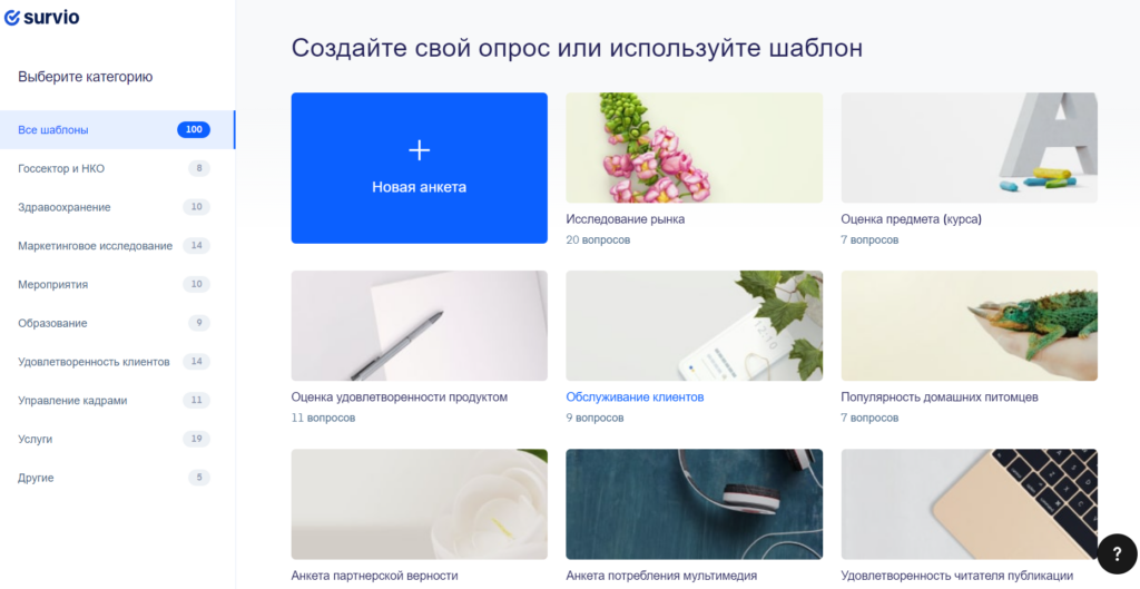 Можно быстро собрать необходимый опрос в конструкторе с помощью готовых шаблонов, которые содержат нужные вопросы для той или иной цели.
