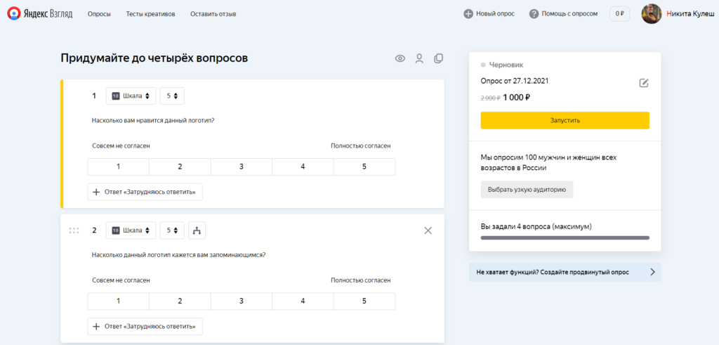 Яндекс.Взгляд — платформа для проведения онлайн-опросов от Яндекса, которая автоматически подбирает аудиторию по указанными вами параметрам: возраст, пол, регион, интересы и все остальное. Для создания опроса есть удобный редактор, в котором есть готовые шаблоны под разные случаи. Все опросы проверяет поддержка Яндекса, поэтому незаконные тематики сразу отклоняют.