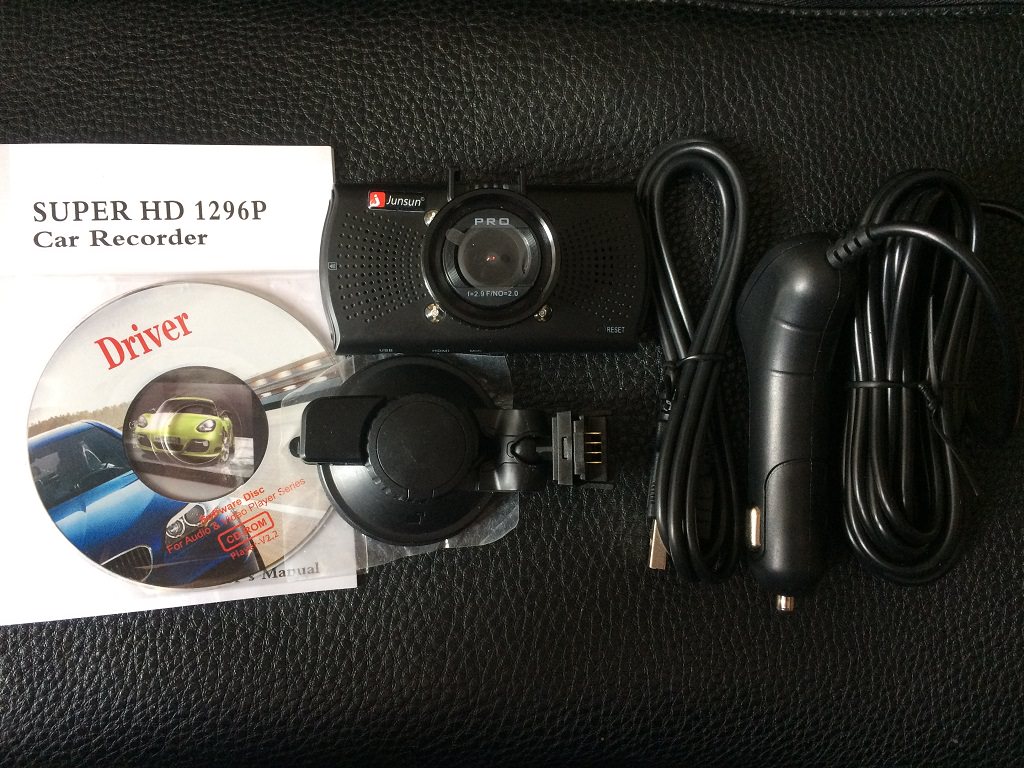 Весь комплект поставки: видеорегистратор Junsun A7810, крепление-присоска, кабель USB-miniUSB, блок питания для автомобильного прикуривателя, инструкция, компакт-диск с ПО.