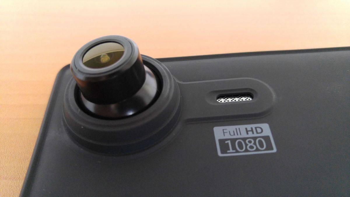 На тыльной стороне в правом верхнем углу расположилась камера видеорегистратора на поворотном сферическом основании. Цилиндр прилично выступает из-за корпуса, поэтому при переноске устройства стоит подумать о защите камеры каким-то колпачком (и не забывать снимать его перед установкой на лобовое стекло). Рядом с камерой имеется небольшое окошко с сеточкой, которое по стереотипу можно принять за светодиодную подсветку. Но, как оказалось, это отверстие для динамика.