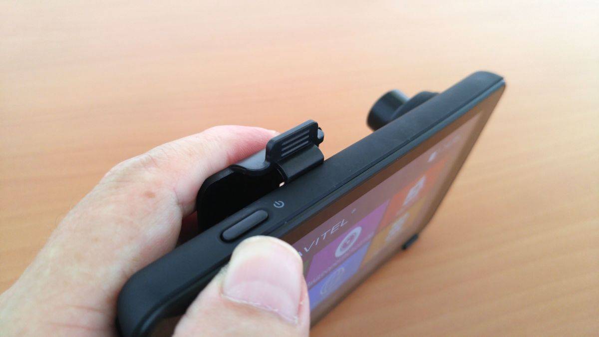 Если вы просто увидите Navitel RE900 с фронтальной стороны, то вы можете подумать, что это смартфон или небольшой планшет. И только взяв его в руки и повертев, становится понятно, что это комбинированное устройство от компании Navitel. Больше всего выдает его, конечно же, большая выпуклая камера с поворотным механизмом. А механизм этот, к слову, выглядит, как глазное яблоко киборга из недалекого будущего. Смотрите сами: