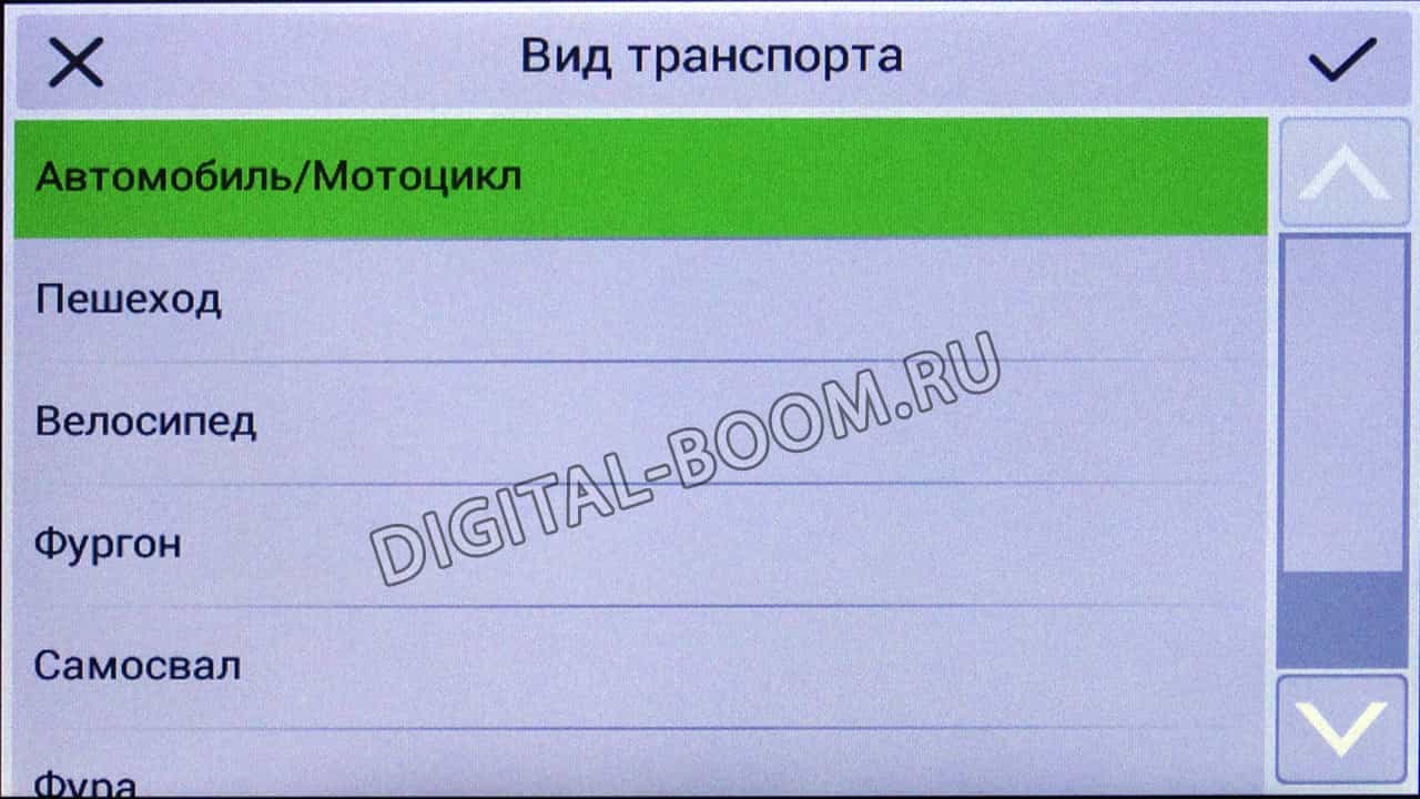 - Выбирать вид транспорта, на котором установлен электронный помощник. Это оптимизирует скорость работы устройства.