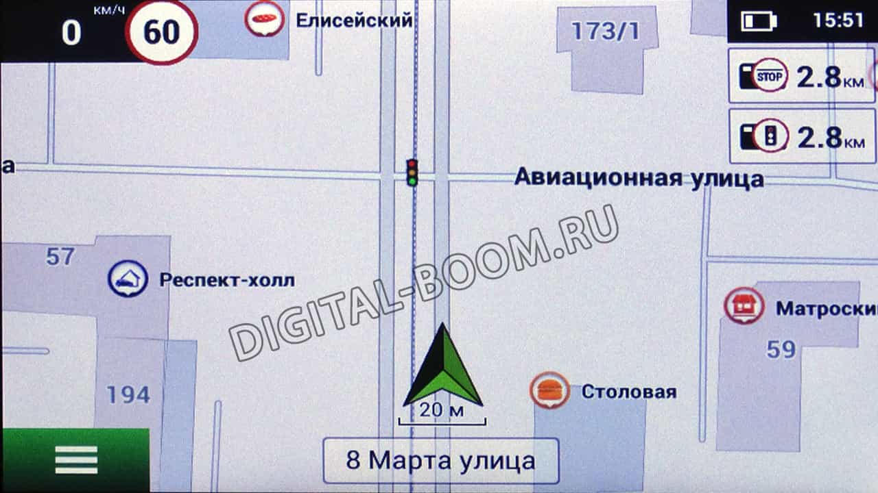 Интерфейс навигатора ориентирован именно на управление пальцами — кнопки меню крупные, не промахнешься. Рассчитано это на 4 дюймовые экраны и на наших 7 дюймах смотрится слишком размашисто. Жаль, что подстроить интерфейс и уместить все пункты меню в один экран, возможности нет. Как нет и опции изменить масштаб карты под разные скорости движения, в том числе и во время стоянки. В частности, масштаб при медленном движении или во время стоянки 20 м явно перебор, а каждый раз кликать по кнопке «уменьшить масштаб», не очень удобно.