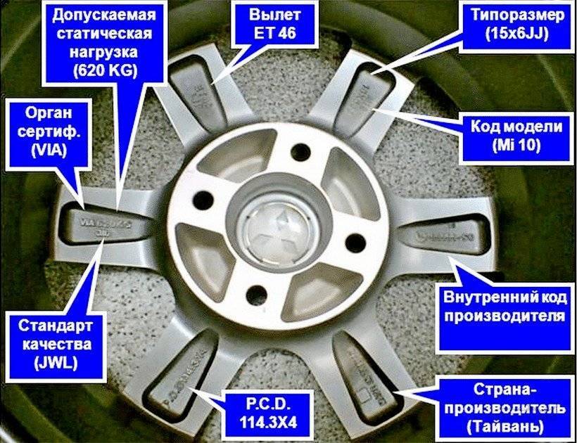 Наиболее распространённые колёсные диски выпускаются с шириной от 5 до 10 дюймов. А самый часто встречаемый тип закраины — «J» или «JJ» (внедорожники). Маркировка наносится на сам обод: у стальных «штамповок» с наружи, а у легкосплавных дисков — внутри полостей спиц. Чтобы не чистить грязное колесо, параметры можно отыскать в инструкции по эксплуатации автомобиля. Также, автопроизводитель наносит на кузов машины информационные таблички с размерами, которые чаще всего можно встретить в таких местах, как: