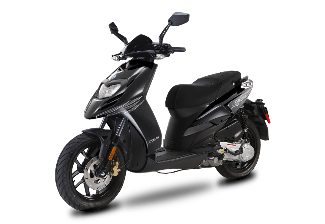 The Piaggio Typhoon 50 reaches speeds up to 40 mph in pure comfort. A dynamic and solid vehicle with a four-stroke, four-valve engine, the Typhoon 50 delivers impressive performance with an extraordinary 144 mpg and a 1.8 gallon tank – the largest fuel tank in its class). Easy to ride thanks to its compact size and flat footrest, you’ll be styling with the simple and sleek Italian design of the Typhoon 50.