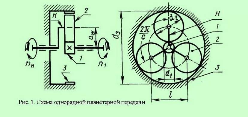 При неподвижном колесе 3 движение передают чаще всего от колеса 1 к водилу Н, можно передавать движение от водила Н к колесу 1.