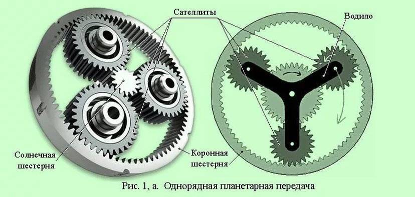 В гидромеханической АКПП чаще применяется планетарный механизм. При его простейшем устройстве крутящий момент подается к солнечной шестерне. С нею постоянно сцеплены свободно вращающиеся шестерни-сателлиты. На них предусмотрено водило, связанное с валом. Если коронная шестерня находится в заторможенном положении, то крутящий момент через водило направляется на ведомый вал. Если шестерня расторможена, тогда сателлиты подают на нее крутящий момент. Ведомый вал при этом неподвижен.