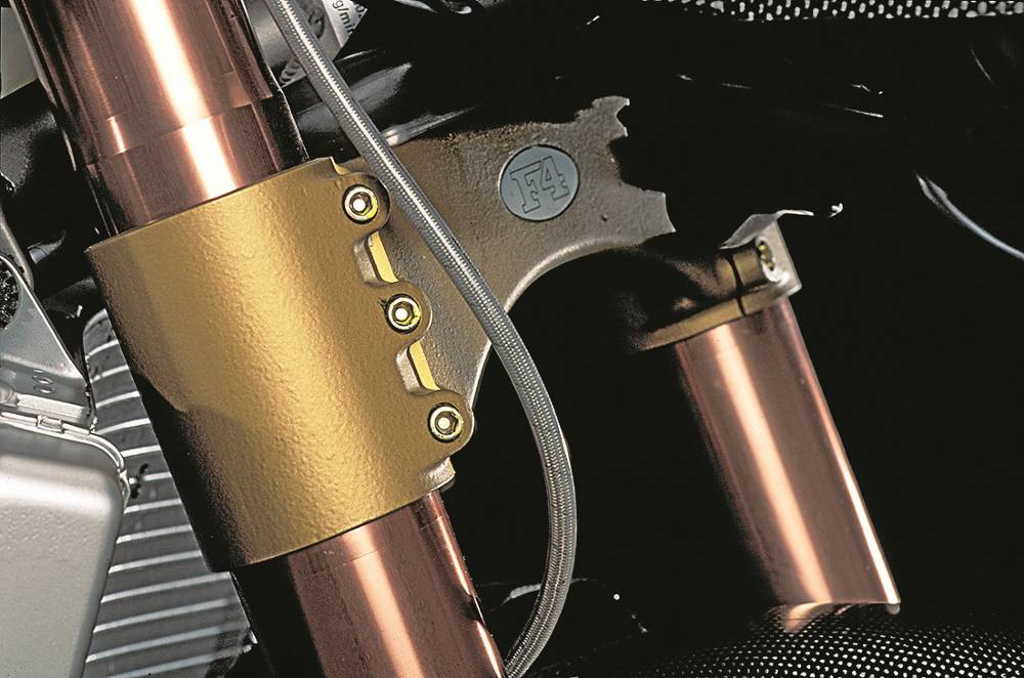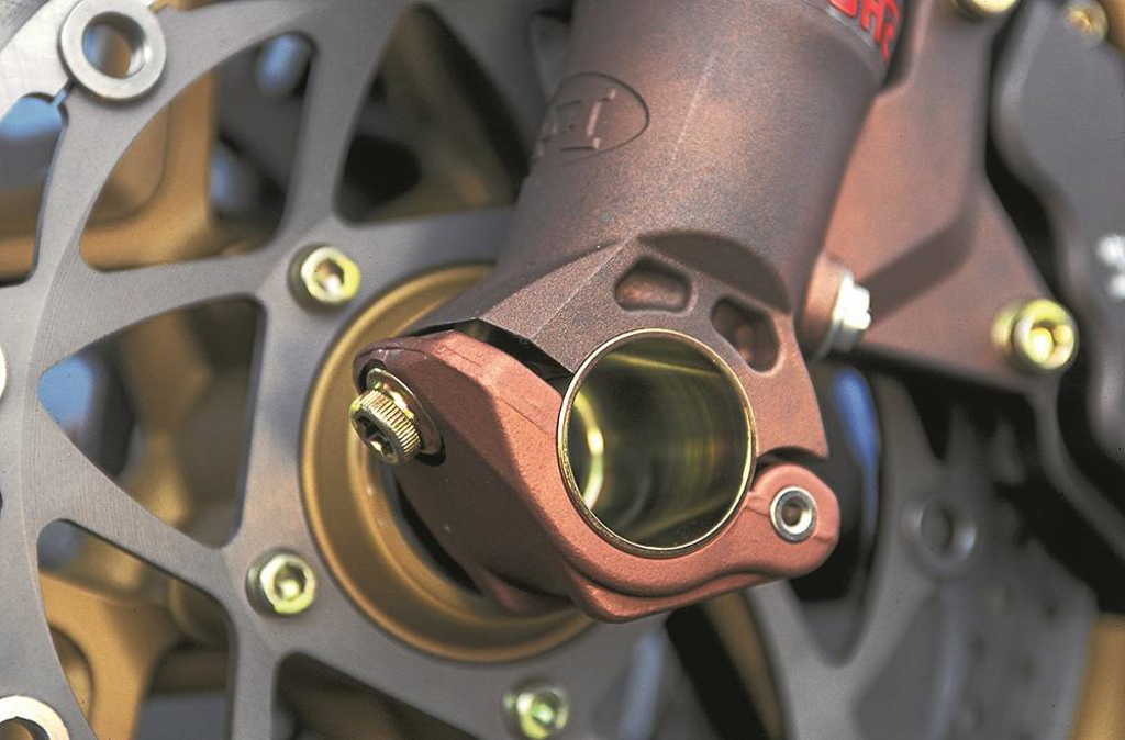 Очень большие диаметры передних осей, в свое время монтируемые, например, в мотоциклах серии F MV Agusta, заботятся о максимальной устойчивости ножек к скручиванию. Конструкторы также здесь не внесли изменения и оставили их диаметр на уровне 30-35 мм.