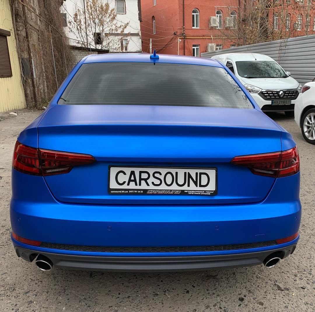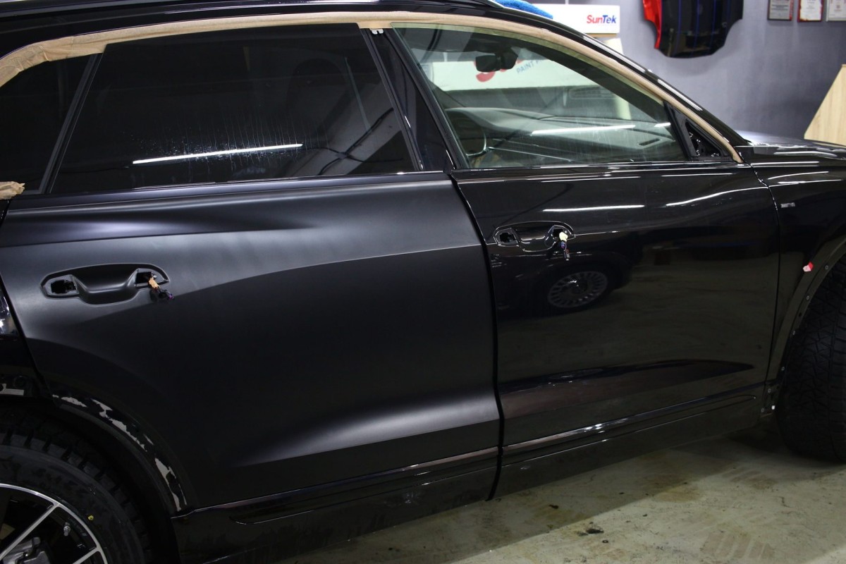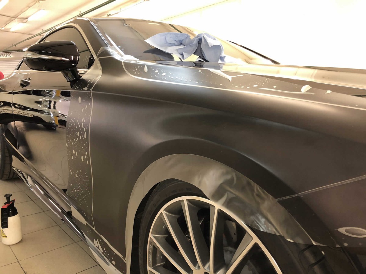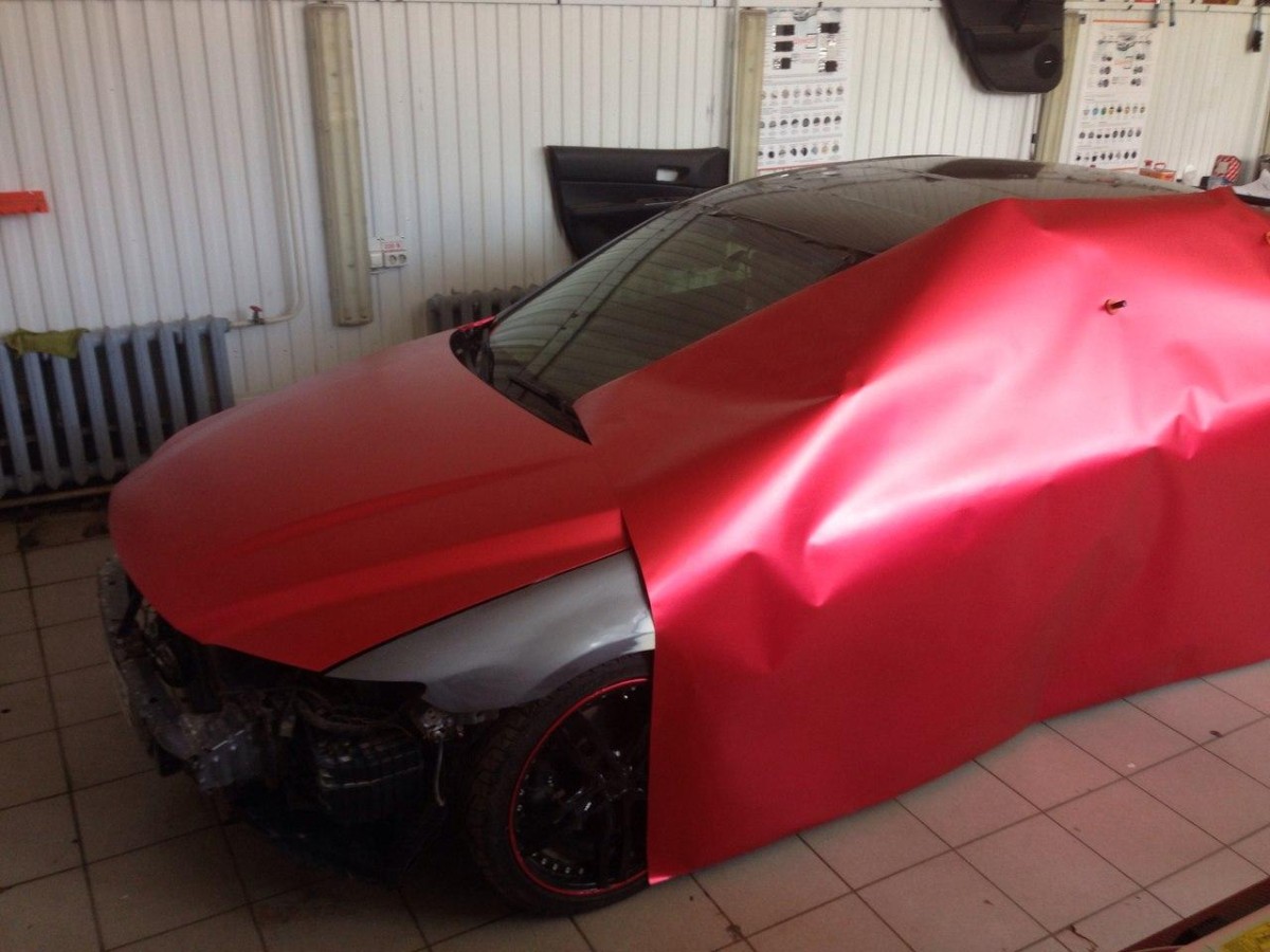 - Обклеить корпус особой пленкой из винила: более дешевый способ. Здесь используется виниловая пленка, которая точно наносится на кузов и плотно фиксируется. В отличие от первых двух способов, где в случае появления царапин возникнет острая необходимость перекрашивать машину целиком, то пленка позволяет проводить замену в прохудившейся части без последствий для всего кузова. А если вам надоест лицезреть матовость, всегда можно избавиться от пленки, и вернуть транспортному средству первоначальный блеск. Недостаток метода заключается в неидеальном результате и необходимости стыковать куски пленки между собой.