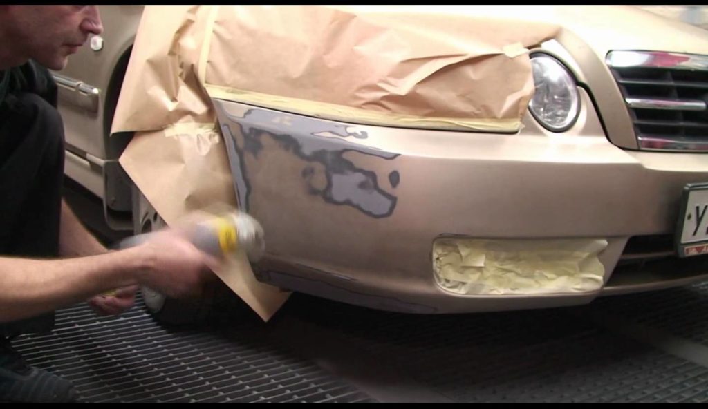 После 15-минутной сушки можно наносить грунт. Поверхности бампера, не нуждающиеся в грунтовке, можно укрыть малярным скотчем. Технология грунтования хорошо показана на видео.