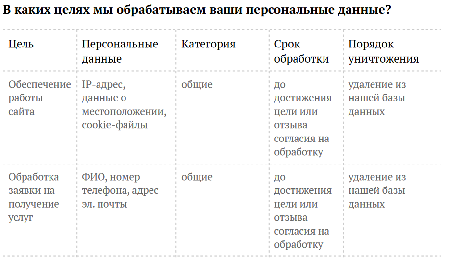 - Переносить блоки текста в таблицы и делать заголовки его частью. Например, в таблице можно рассказать о целях обработки персональных данных:
