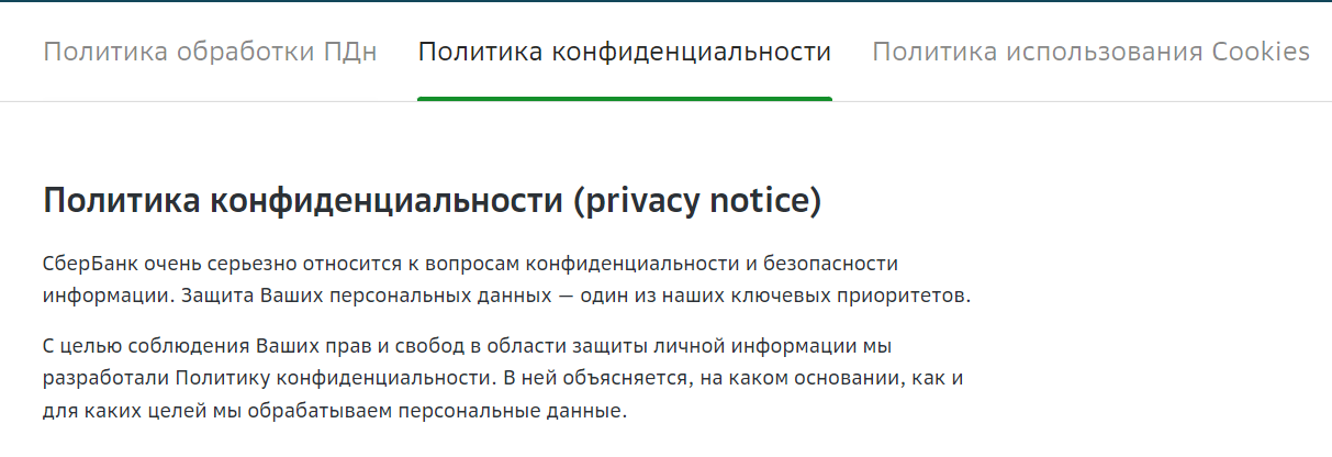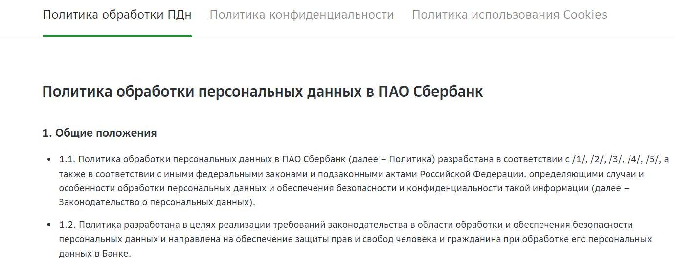 Снова обратимся к сайту Сбербанка. На нём можем найти классическую политику…