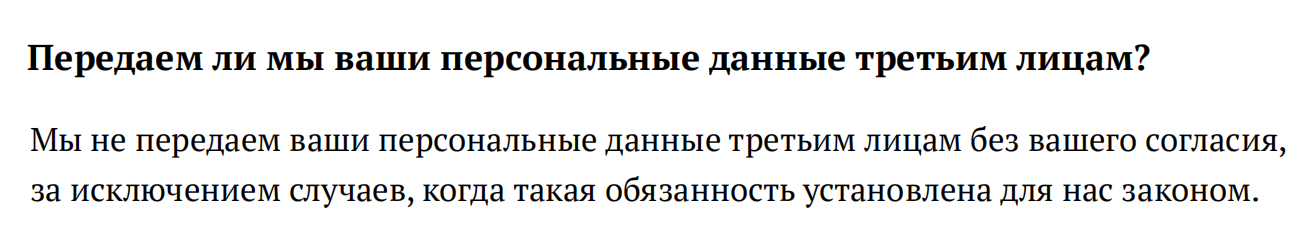 - Исключать цитирование закона. Цель политики конфиденциальности не в цитировании Федерального закона «О персональных данных». Этот документ должен рассказать пользователю о том, как компания обрабатывает и защищает его персональные данные. Но законотворческий слог не всегда понятен пользователю, а чаще просто отпугивает от чтения.