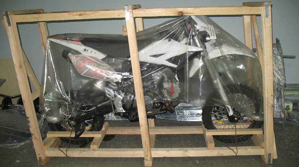Процесс упаковки — это не простое обёртывание байка целлофаном или размещение его в картонную коробку. Для него делается специальная обрешётка, которая выполняет роль жёсткого каркаса и удерживает технику в вертикальном положении. Такие услуги выполняют некоторые транспортные компании, а стоимость будет зависеть от километража поездки и количества использованных упаковочных материалов.
