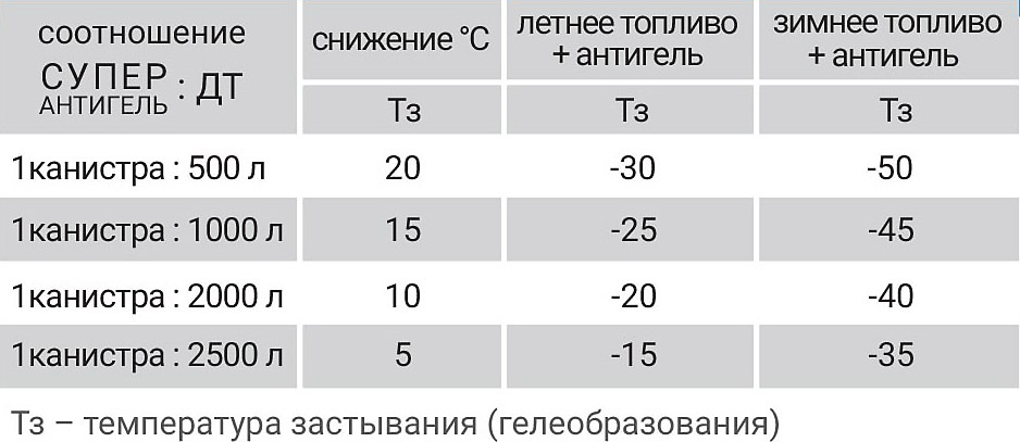 Это, пожалуй, самый основной критерий выбора. Антигель для дизтоплива понижает Т°С его помутнения, застывания и предельной фильтрации. Производитель обязательно обозначает предельно низкие температуры наружного воздуха, при которых возможен легкий запуск дизеля с добавленной присадкой, в зависимости от типа ДТ (летнее, межсезонное, зимнее, арктическое). Уточняется дозировка препарата. Указывается Т°С самого антигеля перед заливкой его в бак.