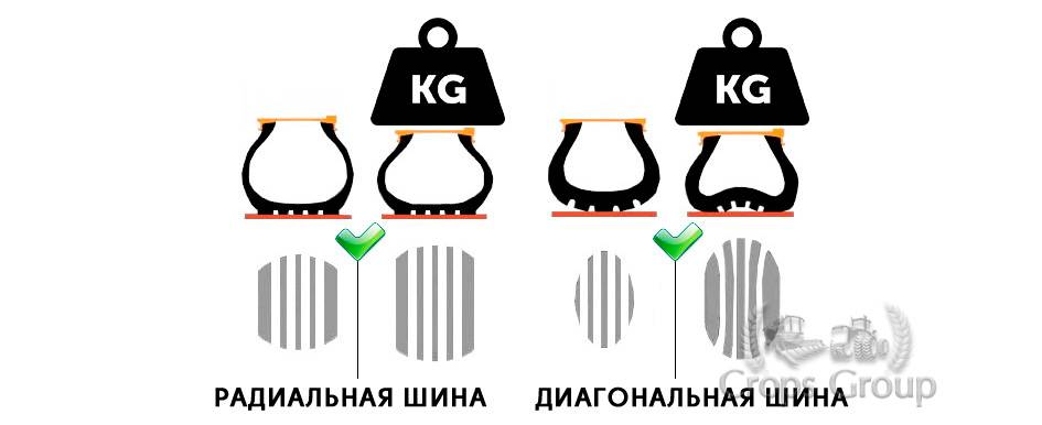 На картинке: Пятно контакта для диагональной и радиальной шин.