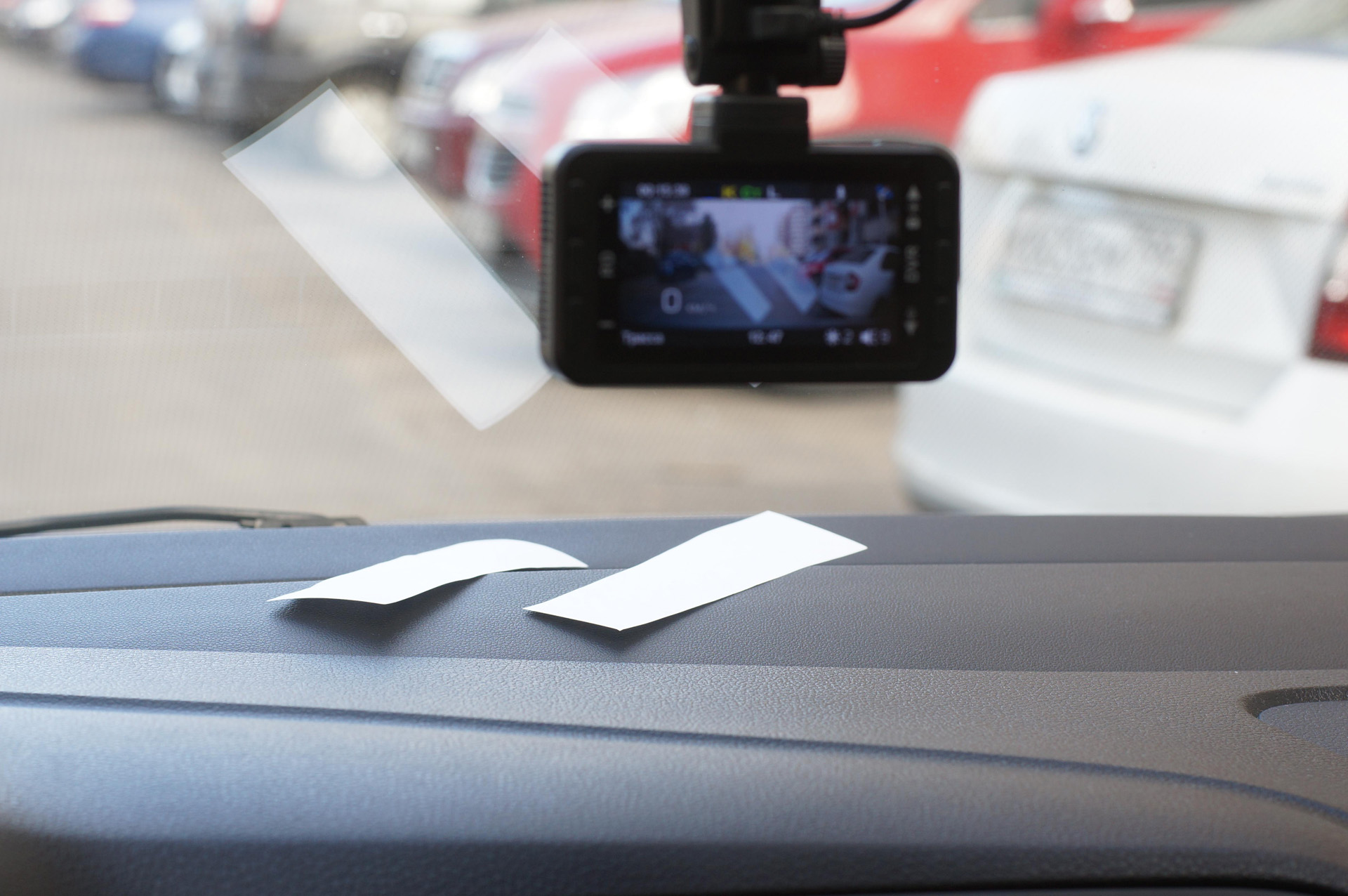 Вот пример типичного авто, в котором торпедо выразительно отражается в ветровом стекле и в светлое, и в тёмное время суток. Хорошо видны прорези воздуховодов обдува, а ещё лучше — контрастные листки белой бумаги, которые лежат для примера: