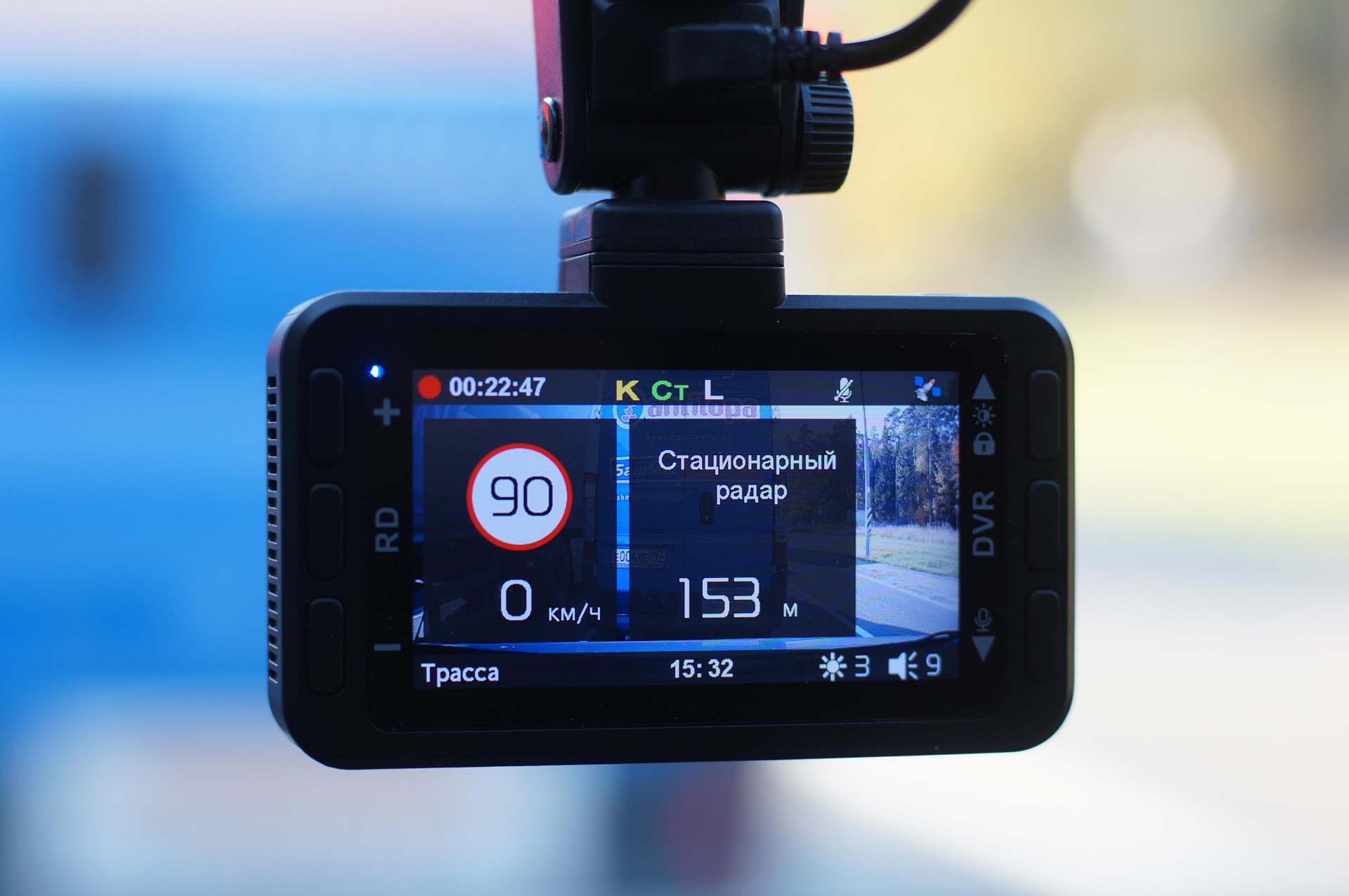 Во время работы на экран выводится вся необходимая информация: тип детектируемого сигнала и его уровень, текущая скорость, ограничения на участках дороги, расстояние до детектируемого объекта, тип камеры и информационные иконки.