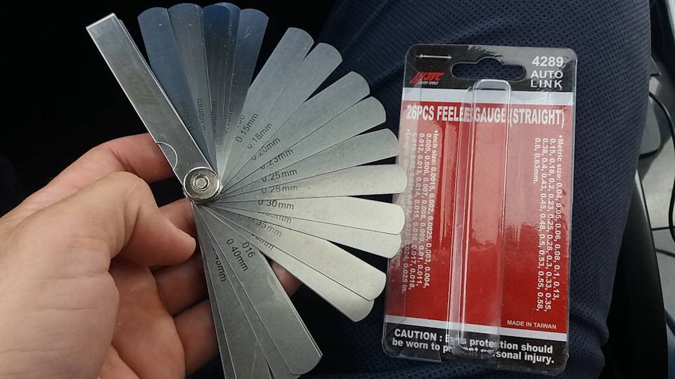 - Проверяем при помощи щупа имеющийся зазор между клапаном и поршнем. Если щуп сильно проскальзывает, либо он вообще не проходит между ними, то нам потребуется регулировка. Если щупа нет, то можно воспользоваться бритвенным лезвием, толщина которого составляет 0,1 мм.