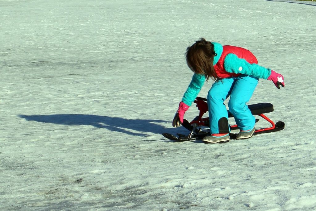 - Повышенная безопасность. Наличие тормозной системы – важная особенность снегоката, существенно повышающая безопасность скатывания со снежной горки. Маленький ездок теперь может притормозить перед препятствием в виде другого ребёнка или столба.